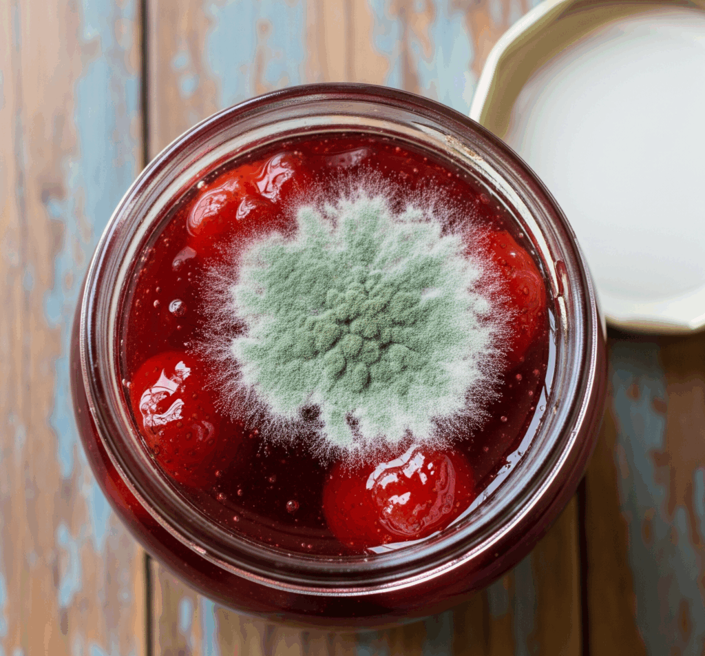 Słoik z dżemem na kuchennym blacie. Niedokładnie zakręcony. Na powierzchni zielony nalot. Wygląda jak obietnica czegoś świeżego, ale to zagrożenie. Pleśń w dżemach potrafi przeżyć cukrową słodycz i rozwijać się dalej. Nie staraj się usuwać wierzchu — całość powinna zniknąć z domu.