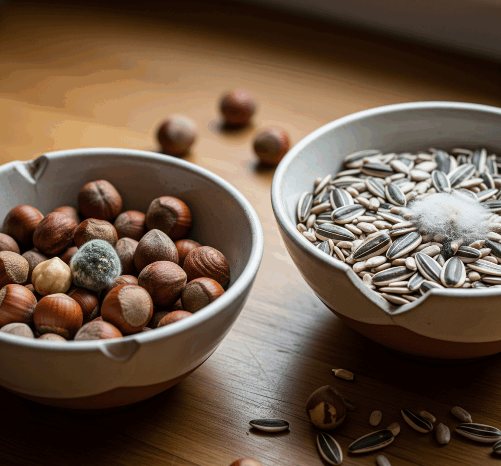 Garść orzechów laskowych, pestki słonecznika. Jeśli przechowujesz je w wilgotnym miejscu lub dłużej niż trzeba, mogą pojawić się zarodniki pleśni. Niektóre szczepy produkują aflatoksyny — niezwykle groźne dla wątroby i ogólnego zdrowia. Zielony lub biały nalot na orzechach to znak, że muszą zniknąć z twojej kuchni.